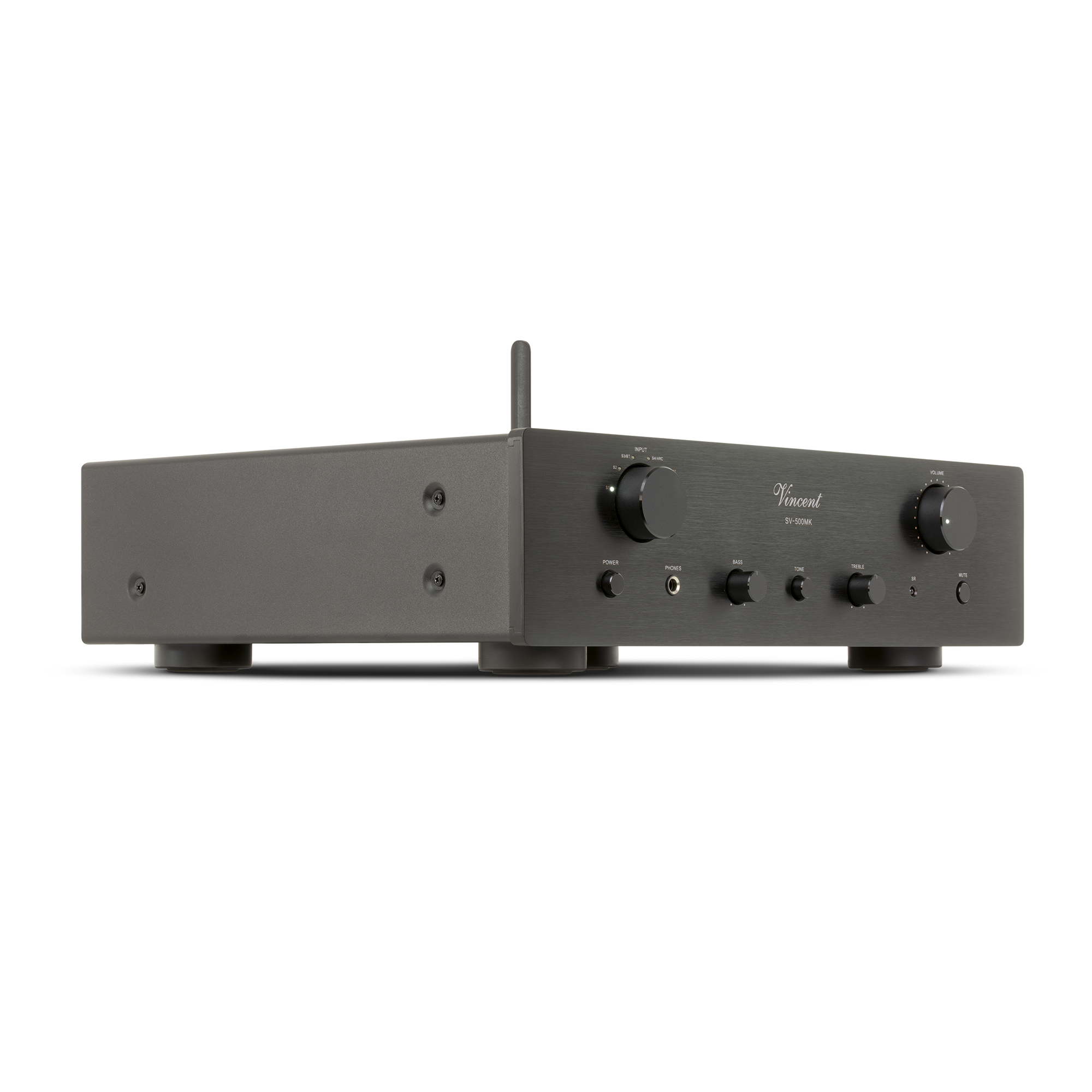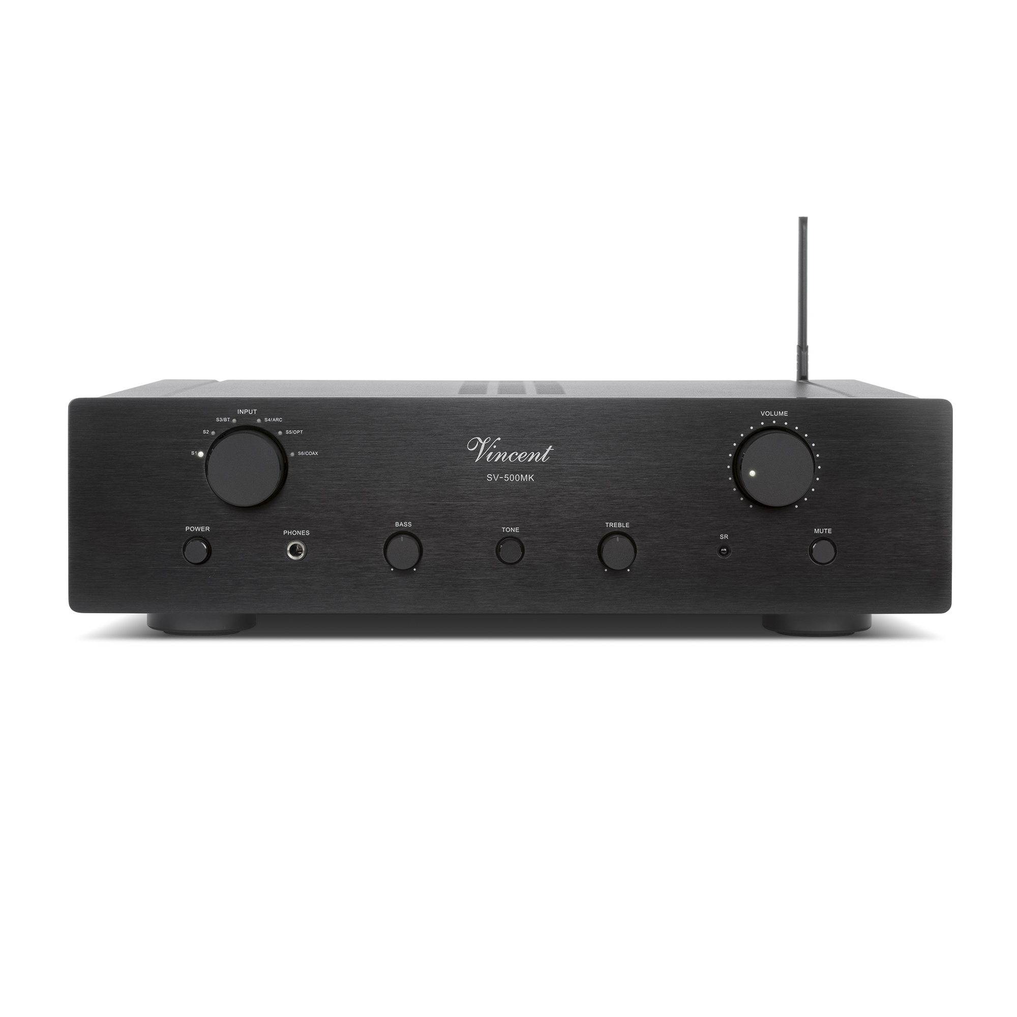 Im zeitlosen Design und mit dem Vincent typischen Klangcharakter präsentiert sich der SV-500 MK. Der Zusatz „MK“ in der Bezeichnung macht bereits deutlich, dass es zum Vorgängermodell keine tiefgreifende Änderung gab, getreu dem Motto „Never change a running system!“ Jedoch verlangen die Bedürfnisse der Kunden nach technischen Weiterentwicklungen. Deshalb wurde beim SV-500 MK die Anschlusssektion überarbeitet. Neben zwei Analogeingängen, einem optischen und coaxialen Eingang, stehen nun auch Bluetooth und ein HDMI Anschluss (ARC) zur Verfügung. In der Eingangsstufe arbeiten zwei 6N1 Röhren und eine 12AX7 Röhre, die das Musiksignal klanglich aufbereiten. Sie verleihen dem Klangbild die bei Vincent gewohnte Natürlichkeit und Wärme. Die finale Verstärkung in der Ausgangsstufe übernehmen dann Transistoren aus dem Hause Toshiba. Im Netzteil arbeitet ein 110 Watt starker Ringkerntrafo. Für die Glättung des Stromsignals und als Puffer stehen dann Kondensatoren mit 20.000 yF zur Verfügung. Selbstverständlich ist im Lieferumfang eine hochwertige Fernbedienung aus Aluminium enthalten, die das edle Erscheinungsbild abrundet.