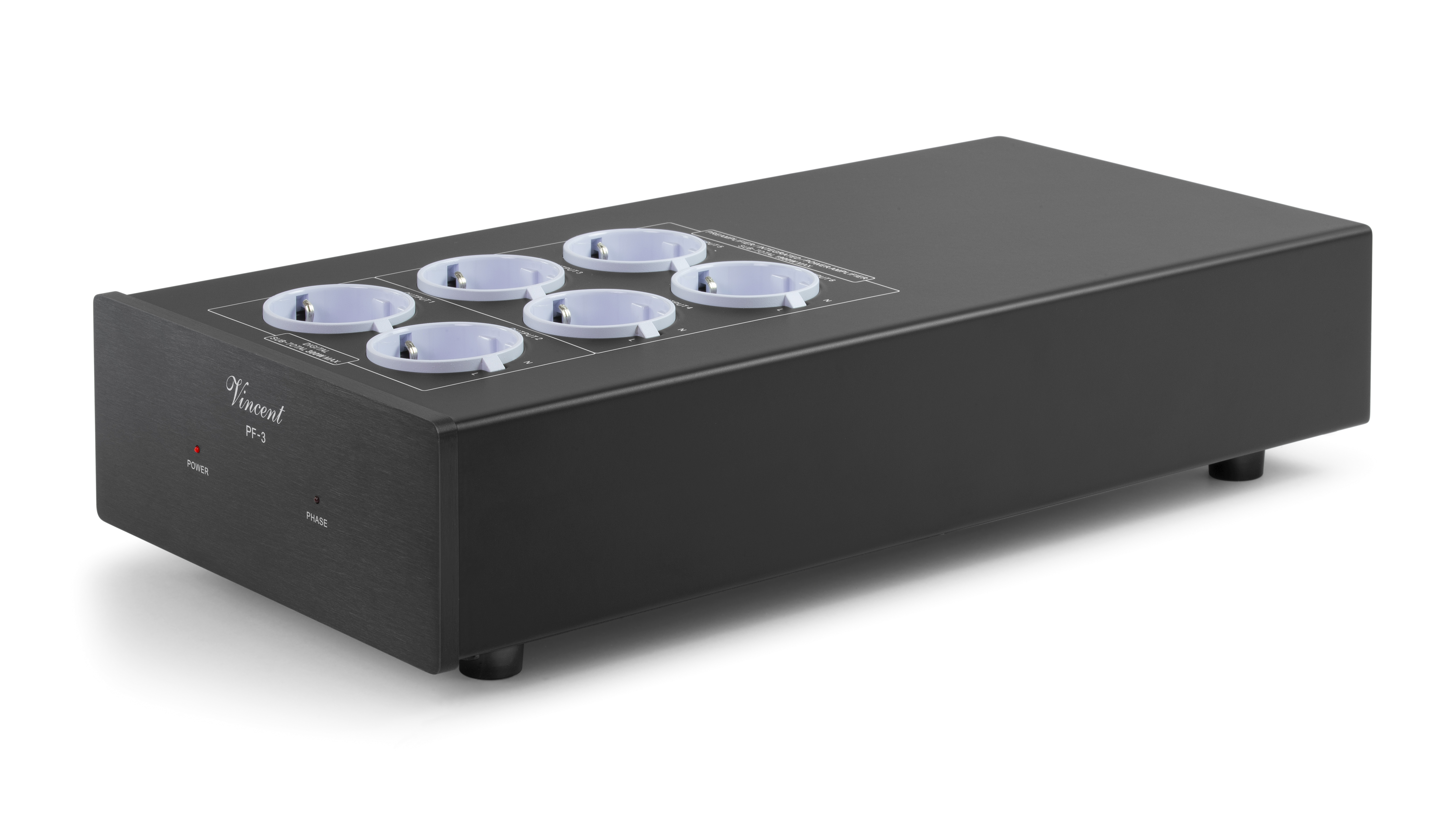 Ohne Strom kommt bekanntlich keine Musik aus der Hifi-Anlage. Ägerlich ist, wenn „schmutziger“ Strom, sich auf die Performance der Anlage auswirkt und den Spaß am Musikhören verdirbt. Gerade in der heutigen Zeit, in der im Haushalt i.d.R. viele Verbraucher am Stromnetz betrieben werden, kann es vermehrt zu Strom- und Spannungsschwankungen und sogenannten Netzrückwirkungen kommen. Auch können Photovoltaikanlagen unerwünscht Gleichspannung ins häusliche Stromnetz einstreuen, die dann im schlimmsten Fall ein mechanisches Trafobrummen verursachen kann. Der PF-3 von Vincent elimiert Störeinflüsse, die vom Stromnetz verursacht werden und gibt ein stabilen und sauberen Strom and die angeschlossenen Verbraucher weiter. Gleichspannungsanteile (DC-Offset) werden konsequent durch den eingebauten DC-Blocker entfernt. Insgesamt ist der PF-3 mit sechs Schuko-Steckdosen ausgestattet. Alle Dosen sind EMI und DC gefiltert. Zwei Steckdosen sind speziell für Digitalquellen ausgelegt. Vier weitere Steckdosen stehen für Geräte, mit hohem Stromverbrauch, zur Verfügung. Ein automatischer Überlastschutz sichert den Filter ab.