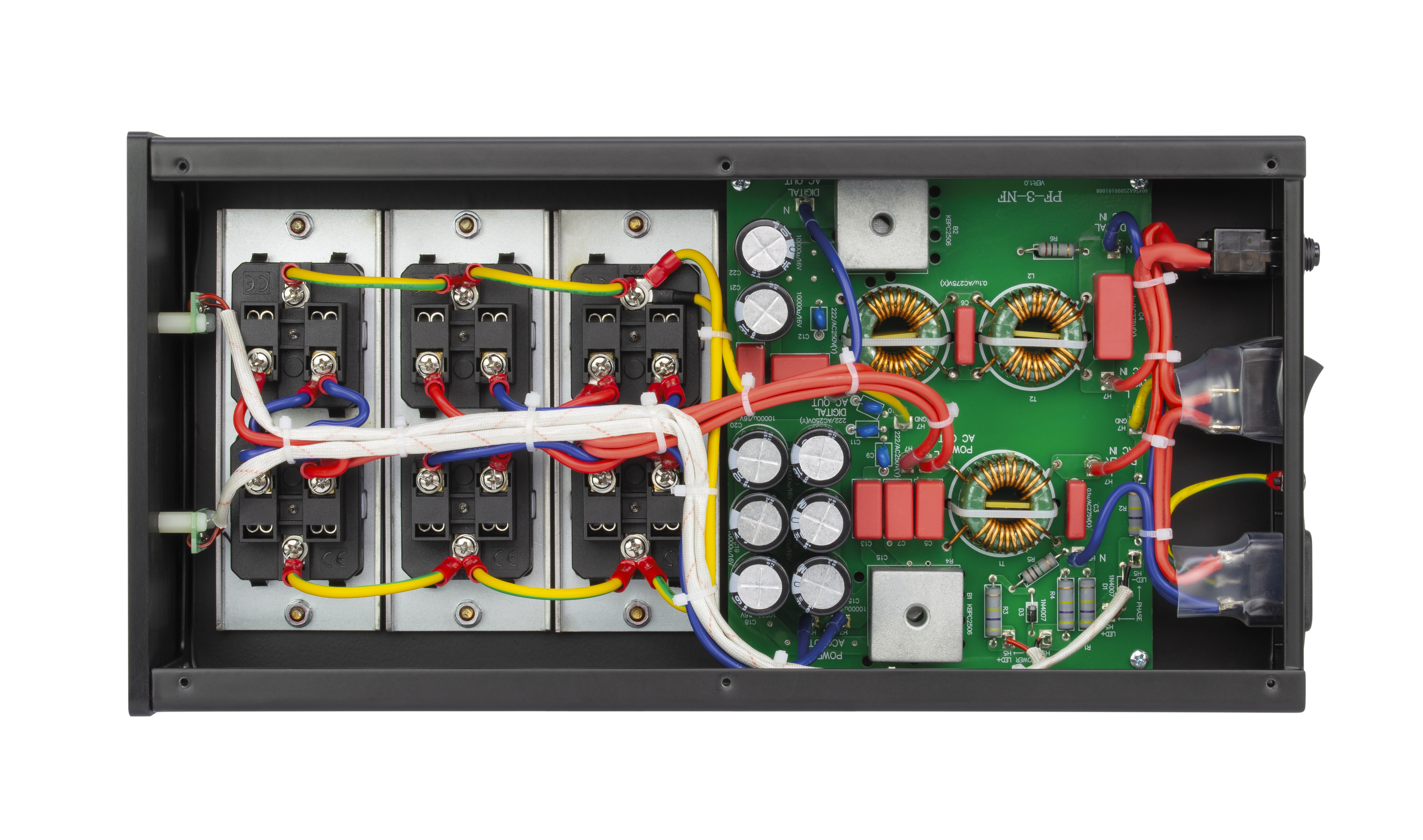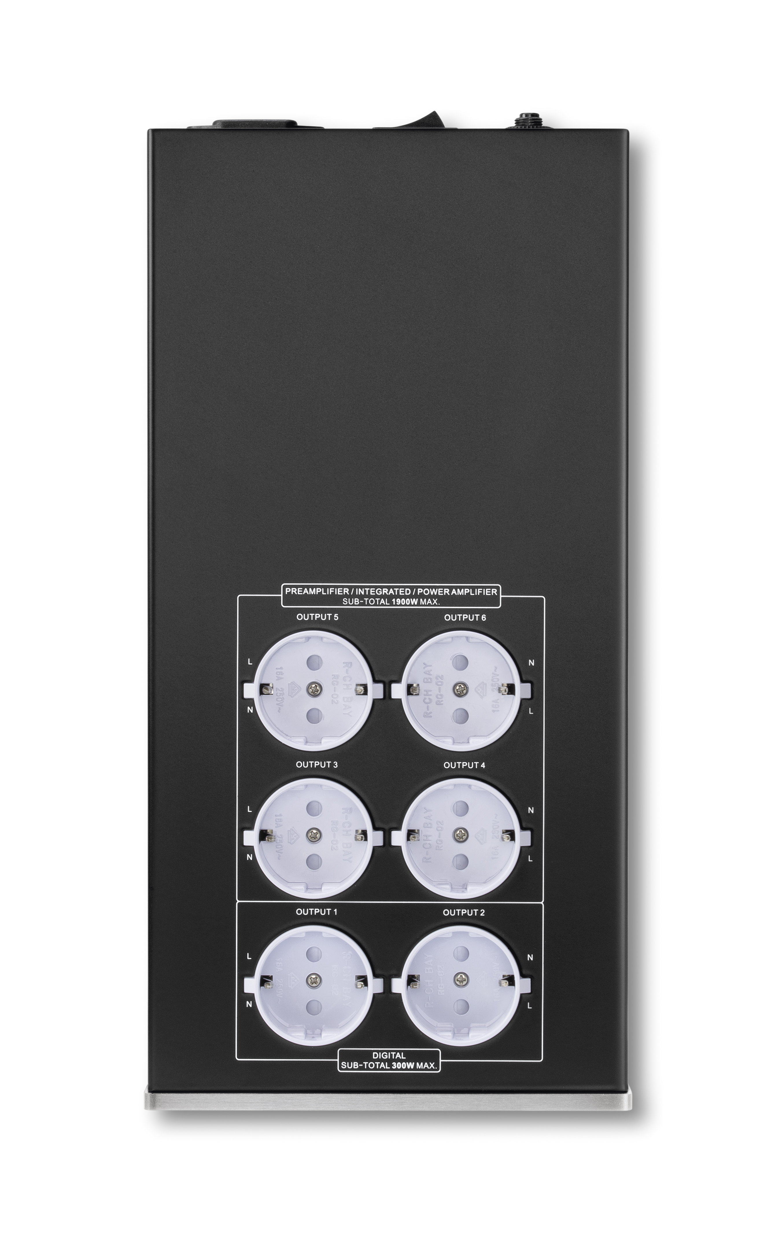 - Ausgänge: 2 x Schuko-Steckdosen für Digital (300 Watt), 4 x Schuko-Steckdosen für Analog (1900 Watt)